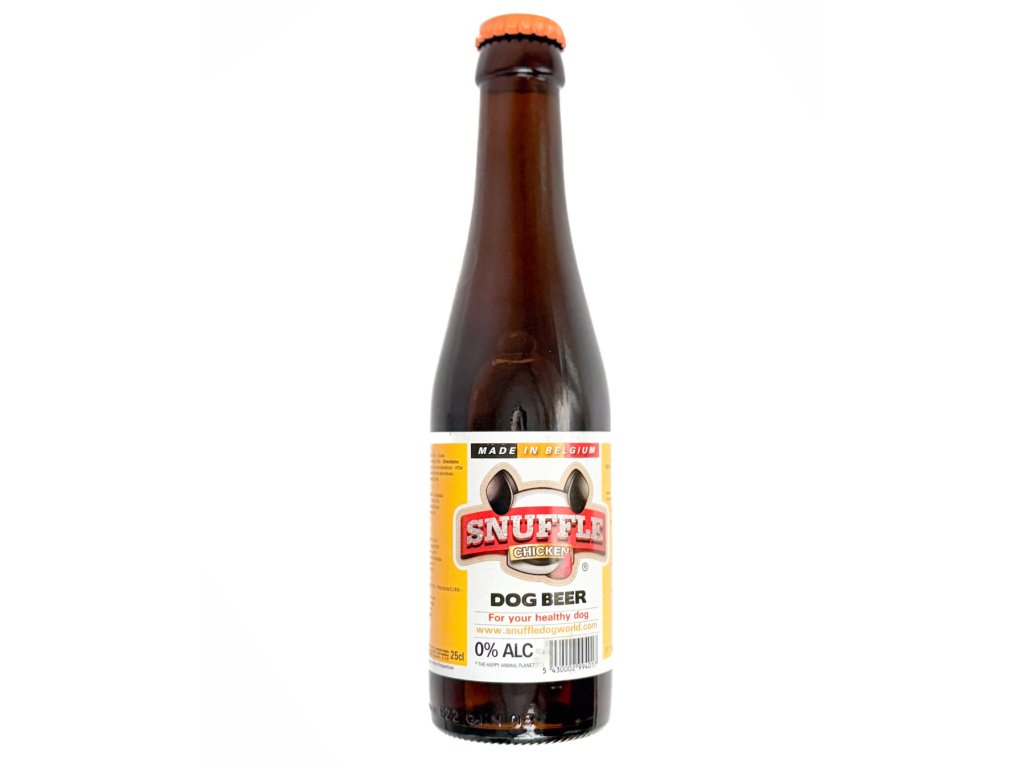 Snuffle Dog beer je delikatesní tekuté občerstvení pro psy s kuřecí nebo hovězí příchutí, kterou psi milují